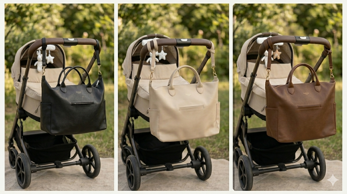 Bevestigen onze luiertas aan uw kinderwagen met de meegeleverde kinderwagen-haken.